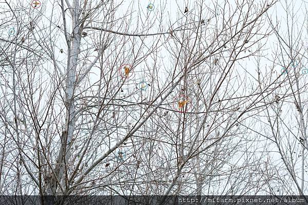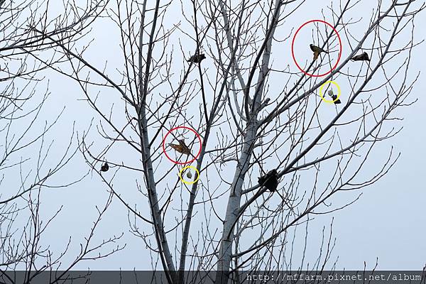 右上紅圈是青背山雀抓著蛾,中間紅圈是一對交尾中的銀目天蠶蛾,兩個黃色圈是繭,可能已「蛾去繭空」。