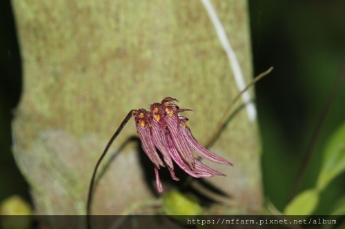 紫紋卷瓣蘭( Bulbophyllum melanoglossum )今年長了兩根花軸,目前有一根盛開中喔,另一根還過陣子才會綻放。
