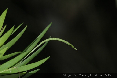 二裂唇莪白蘭(Oberonia caulescens)長出花軸囉,預計下個月就會開花了。