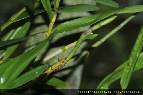 好幾年沒開花的竹柏蘭(Cybidium lancifolium)終於長出花苞了,應該會在這個月底綻放吧。