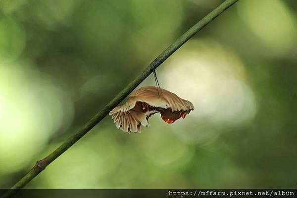 圖中右側有一個剛羽化的空殼,推測有可能是雌蝶剛羽化就被雄蝶找到並進行交尾