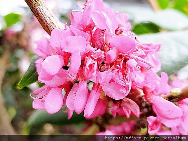木本的豆科植物,主要花期在春天,秋冬時候會落葉,春天枝條上開滿粉紫色小花,秋天偶而零散開花