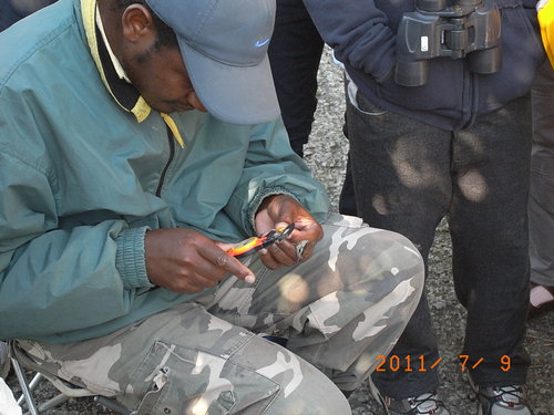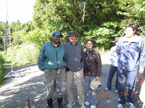 途中巧遇森林系研究計畫的田野工作小組,親眼目睹替小鳥抽血量身的過程,尤其來自肯亞的專家Mr. Sylvester Karimi 所展露的專業身手和純真善良的微笑,忍不住要和他合影留念.
