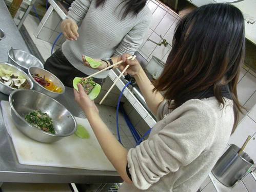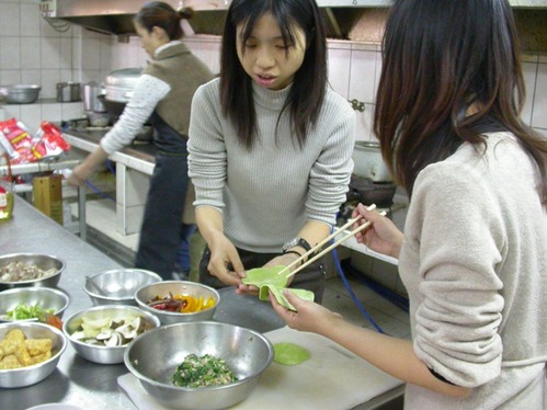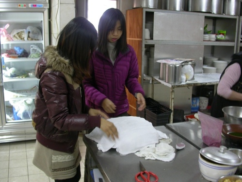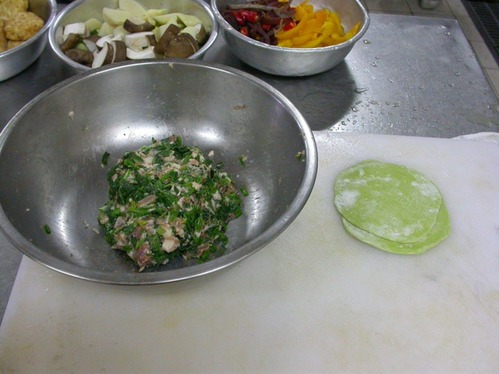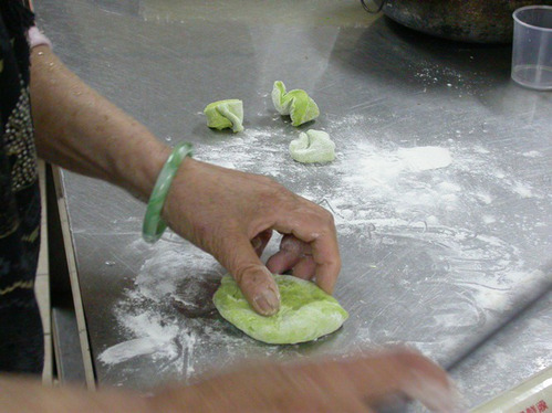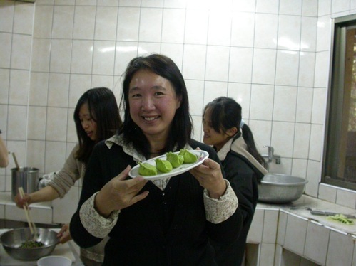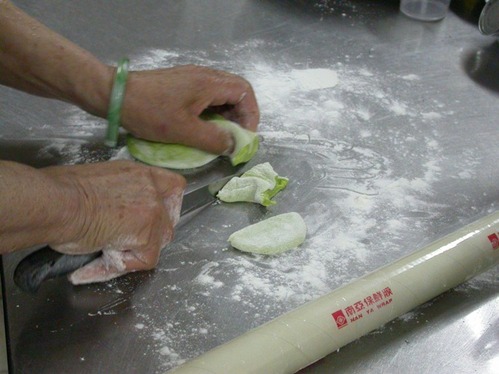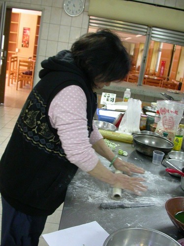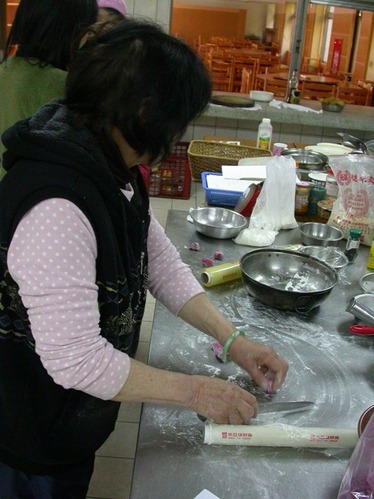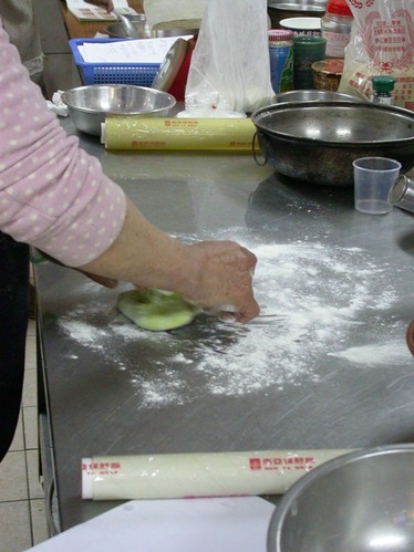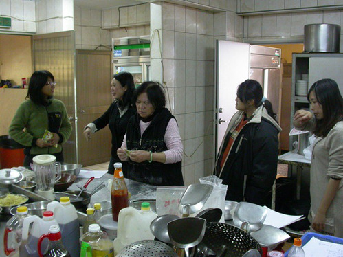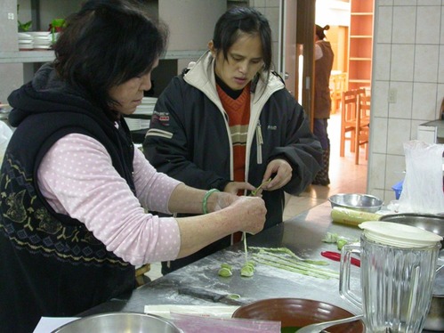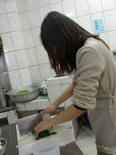 ↑另一頭,同事們則忙著準備水餃的餡料,先切菠菜吧!