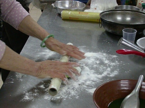 首先,來做饅頭吧!取一定比例的酵母粉、甜菜根粉、麵粉、糙米粉加水攪拌在一起,再加上多咪阿姨熟練柔軟的手勁不斷的來回搓揉,等到麵糰呈現一定的柔軟度,就可以將它用保鮮膜蓋上,上鋪數條毛巾,放到外頭陽光下(因為梅峰現在很冷,怕發不起來。),下午的時候它就已經發好,可以做成饅頭了!