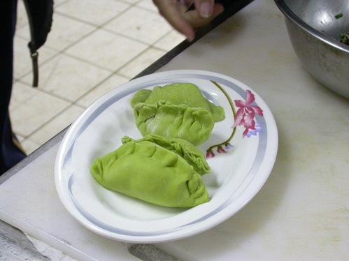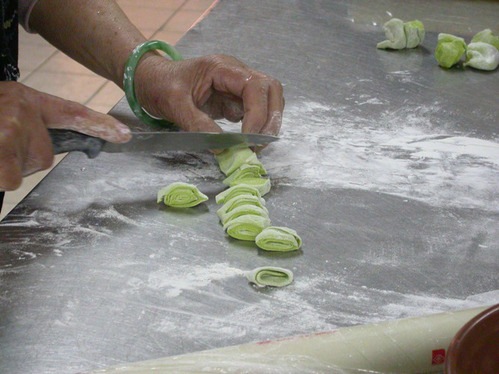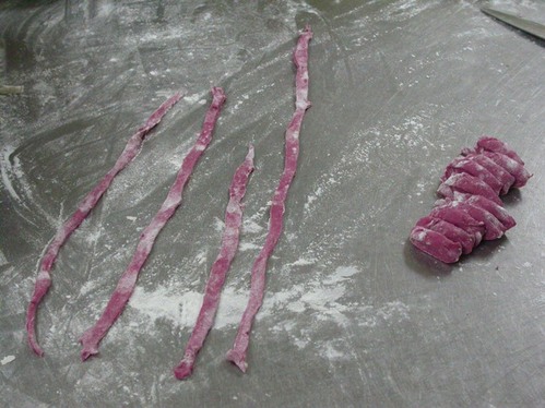 接下來,我們用菠菜和甜菜根來做麵條和水餃皮!這些我們平時經常食用的食材,其實製作的方式一點都不難。只要把麵粉加水、加入甜菜根或菠菜汁液,搓揉、擀平後,將一部份的麵糰分開準備待會做水餃皮用,剩下的擀成呈橢圓形狀,然後將橢圓形狀的麵皮像菸捲般捲好,再用刀子隔一定距離切下,用手指頭拉開,就完成手工麵嘍!在上頭灑上一些麵粉,讓麵條不會黏在一起,就可以等著煮來吃了,非常簡單吧!