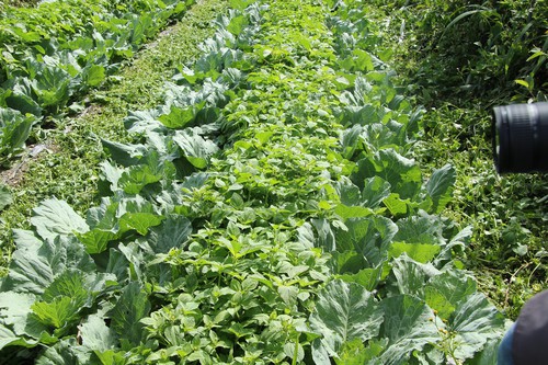 園裡滿滿的一區區高麗菜,都是在莊先生的自定的時間表下一步步種進去的,可以看到格外的,被倒頭栽丟在地上,還兀自努力長出沒有根的菜芽,還帶根的高麗菜雖然結球處被採收了,仍努力長著菜芽的部分仍然會種在土壤中一陣子和草一起共生,直到下一批菜苗即將種下,才會整理土地,重新施肥,以保持土壤的微生物總是在有植被的狀態下。