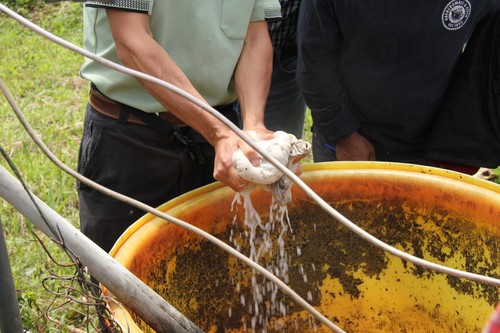 3. 300c.c.苦楝油加入5公斤的水確認攪拌均