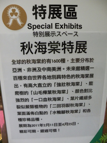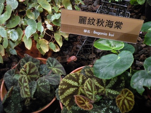 此特展展出約一百種的秋海棠,有會爬樹的,葉子邊緣有著金粉反光般色澤的,還有葉子上還長出葉子的,葉上有金線像是嘴唇般的……..。除了印象中在登山小徑旁常見的水鴨腳秋海棠、溪頭秋海棠外,原來秋海棠還有這麼多番面貌!是非常值得一看的展覽呢!110223