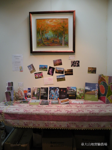 用過午餐後,大夥分工合作,放假中的同事阿雅、佳容也陸續前來幫忙。有人負責掛掛鉤、有人負責畫寫畫作說明、有人利用小黑板分享關於梅峰營隊的活動資訊、有人掛畫、有人陳列出版品……,就這樣小小的展示空間逐漸變得豐富而溫暖。