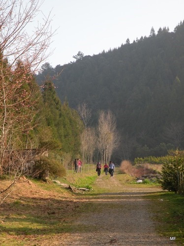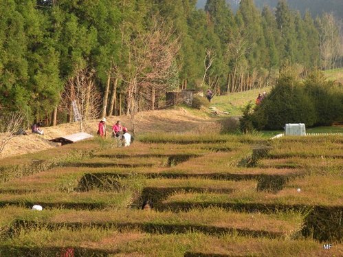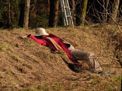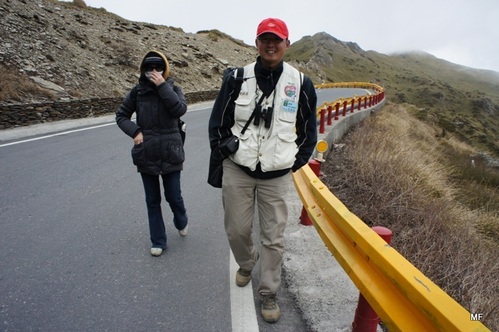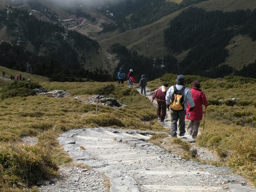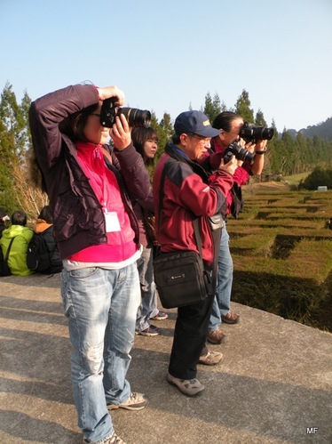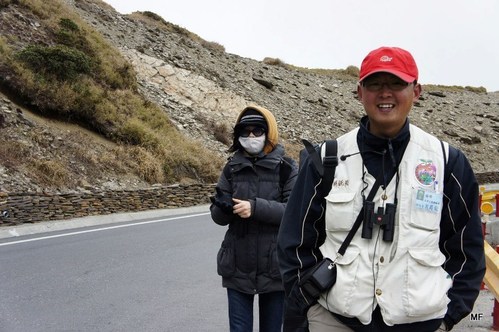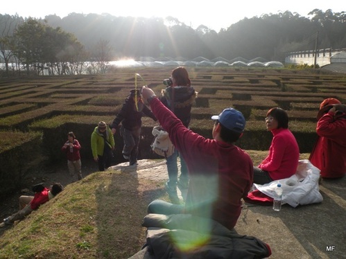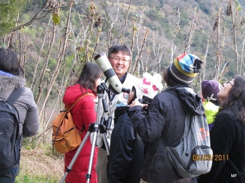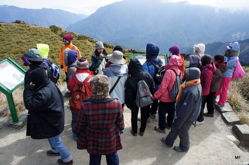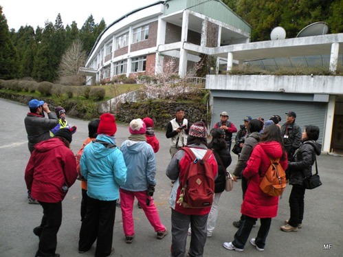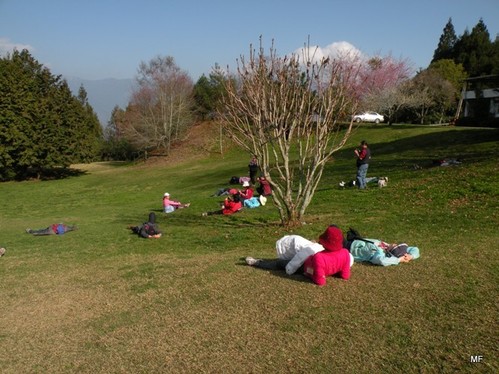 一抵達梅峰,台灣山岳的好朋友們就先躺在梅峰的伴月坡,或脫下鞋子,或側躺打滾,盡情的享受難得的放空時刻。老天賞給了大家一個燦爛的藍天,整個下午,分成兩隊,緩步漫走梅峰場區,看了由梅峰同仁辛苦佈置、燦爛無比的溫帶花卉區;站在白楊觀景台上遠眺奇萊、合歡群峰;坐在迷宮區的大水塔上,幫夥伴們指揮走出迷陣;還有陣陣山嵐飄盪,彷然如臨仙境…….,享用過晚餐,欣賞梅峰四季簡報,領略繁星如鑽的黑夜;隔天一大早的賞鳥,後來變成相機透過單筒拍照的教學活動,不過還是看到很多鳥以及盛開的櫻花!