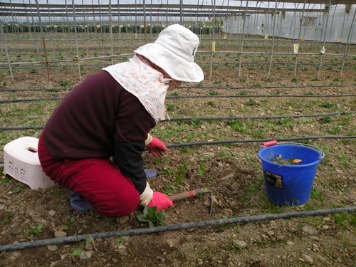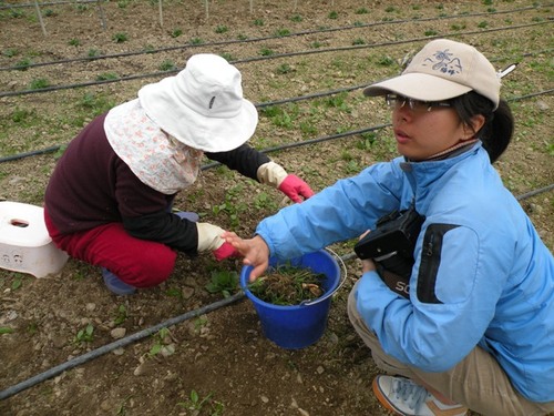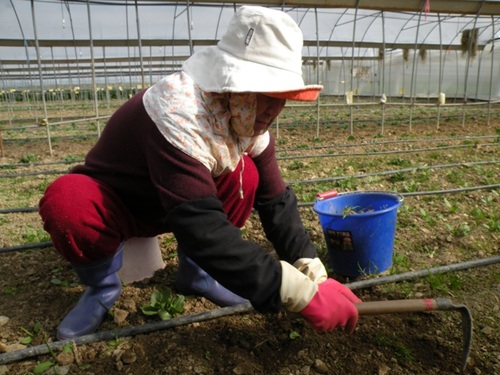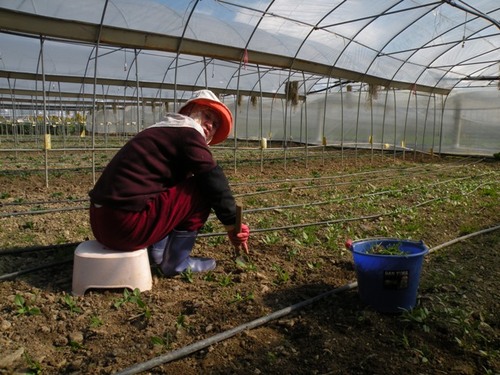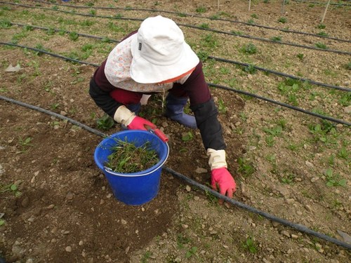 11.02.10這天我們來到戶外的菠菜區紀錄菠菜疏苗的過程。多咪阿姨一邊俐落的拔除雜草和太過擁擠的小苗,一邊不厭其煩的回答我們層出不窮的問題。她說這次拔除小草後,就不用再拔了,因為菠菜之後會快速的生長,它大大的葉子會遮住大部分的陽光,讓來不及長大的小草因為曬不到太陽而夭折。