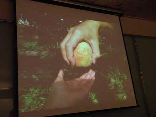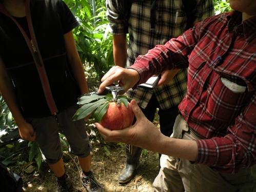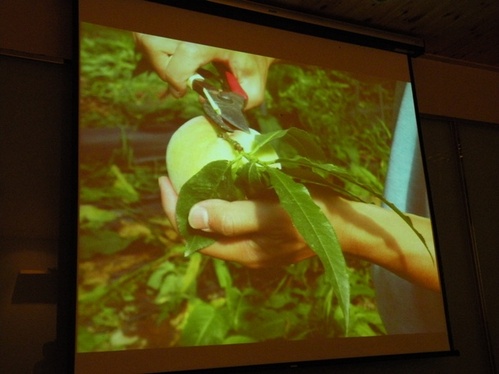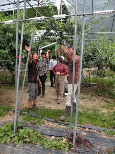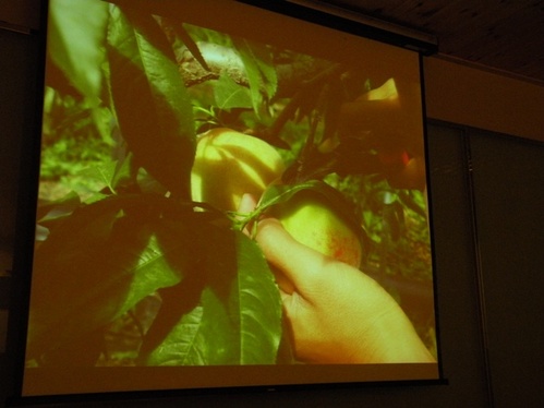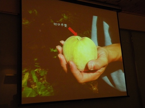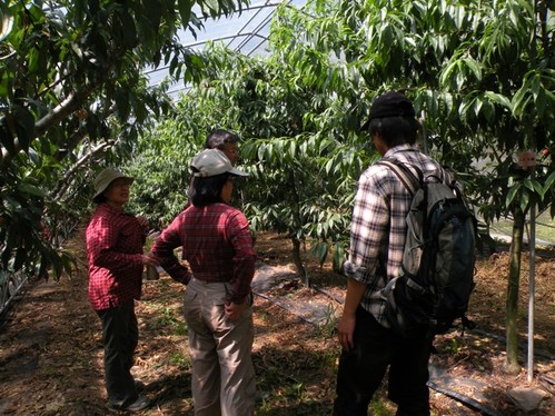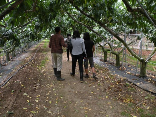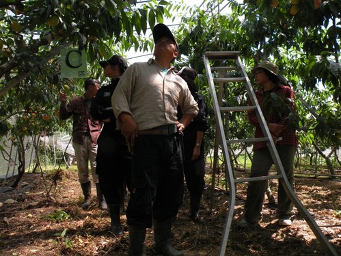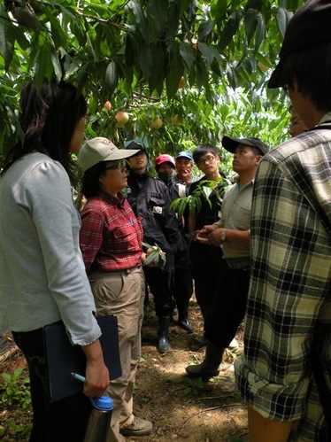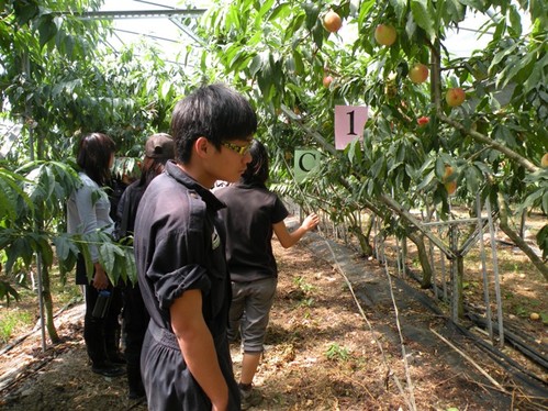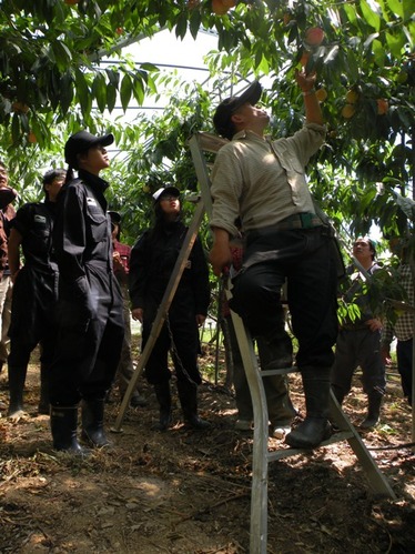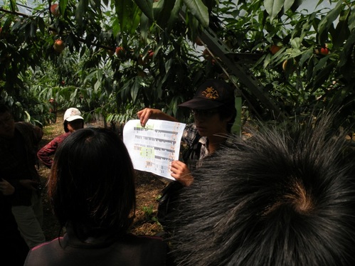 而一開始,由解說員蜀龍幫大家上了一堂採果的簡報後,才魚貫的來到水蜜桃園,進行實地的演練。