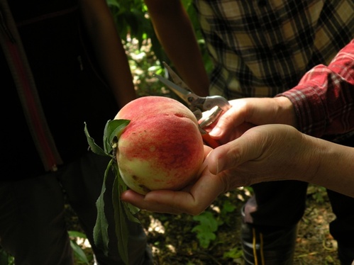 ↑需要特別注意的是,位在枝梢的水蜜桃可以用剪刀剪下,粗大枝條末端的則建議用手輕輕掰下。(解說員會在現場示範給您了解的!)