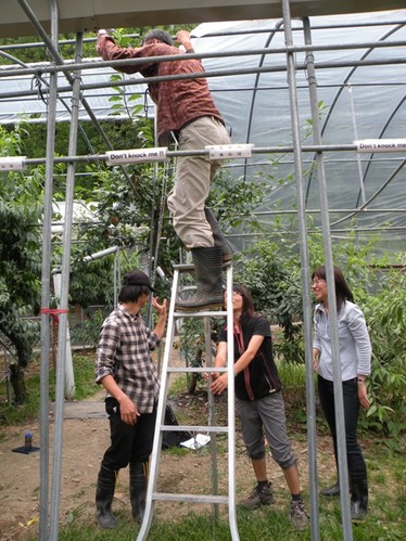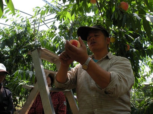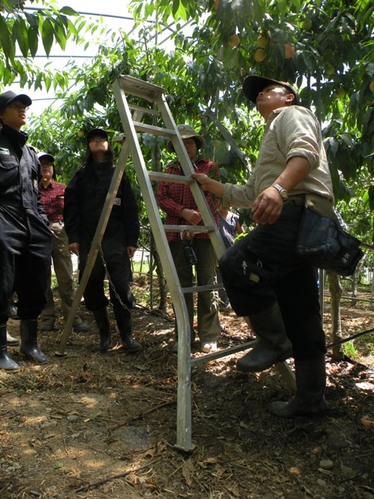 首先把梯子穩固的安置在地面,而水蜜桃是非常嬌貴的水果,所以採果的時候請「看好下手」,千萬不要每一顆都捏捏看!那可是會對水蜜桃造成極嚴重的損害呢!