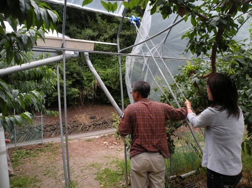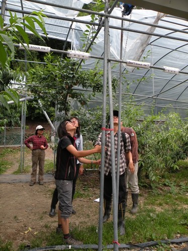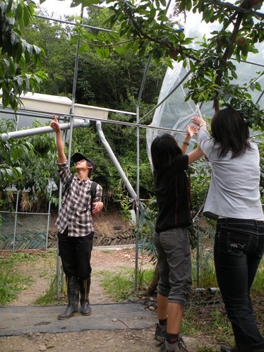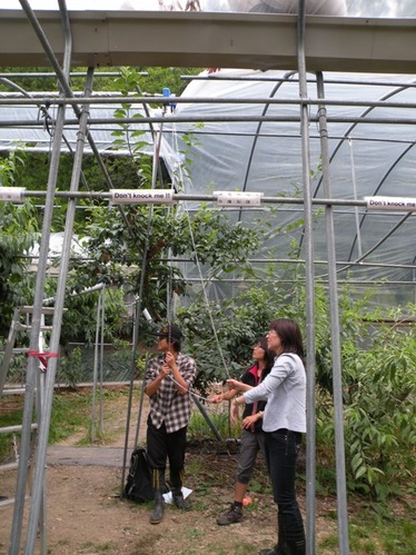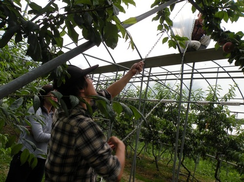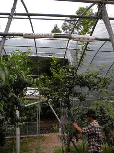 ↑只是天氣太熱的話,桃子也會吃不消,所以經營組同仁今年特別設計了捲揚式的塑膠布,可以視情況讓覆蓋在果園上頭的塑膠布收起,露出天空,讓水蜜桃透透氣!