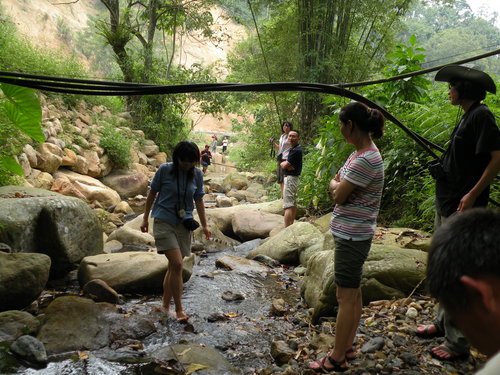 ↑脫去鞋襪,讓雙腳感受溪水的沁涼,一邊還不忘找尋蜻蜓的行蹤。