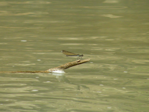 ↑棋紋細蟌靜靜的停棲在突出水面的枝條。