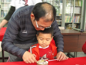 圖:陳爸爸協助信宇弟弟完成他獨一無二的杯墊。
