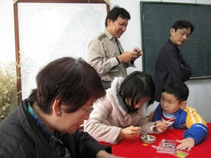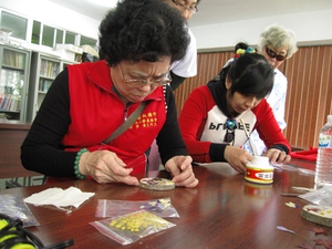 圖:阿嬤說:我是第一個完成的喔!!(註:阿嬤後來還當小老師,協助薛指導大家做杯墊喔!)