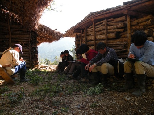 ↑解說員聖琳分享民俗植物的典故,解說員坐在新建的原住民家屋旁聆聽。