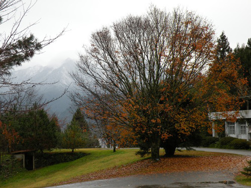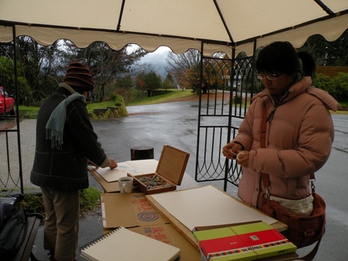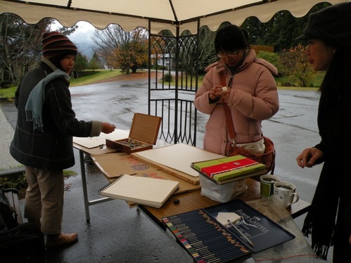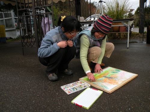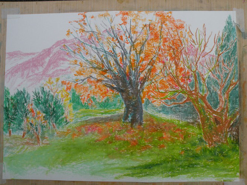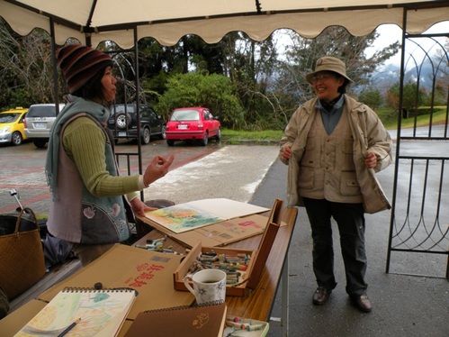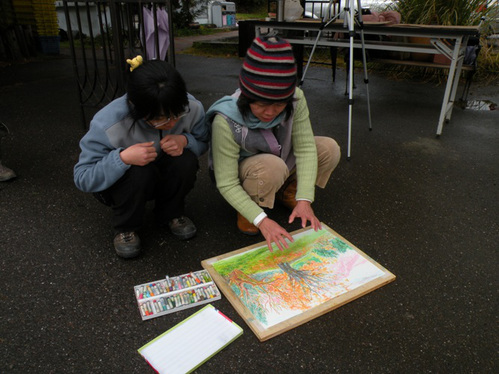 新年度開始的第三天,畫畫老師也來到了梅峰。在雨勢稍歇的清朗裡,不用帶隊的解說員俐璇、芭樂請了假和畫畫老師一起站在展售部旁的涼亭裡,拿著蠟筆或色鉛筆,專注的對著覆雪奇萊和紅葉青楓,被霜冷逼得一身鮮黃的伴月坡做起畫來。畫畫是件很快樂的事,尤其是可以在美麗的地方,與好朋友們一起。