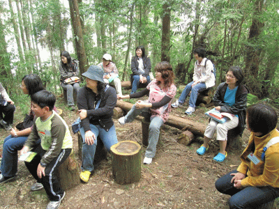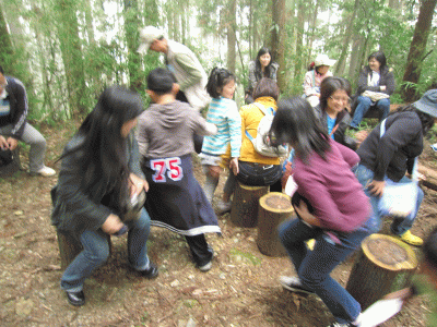 從東眼山森林遊樂區參訪回來後,令解說員們印象深刻的生日遊戲。(根據出生月份順序來想辦法在木頭上移動)