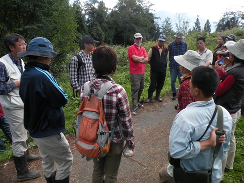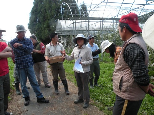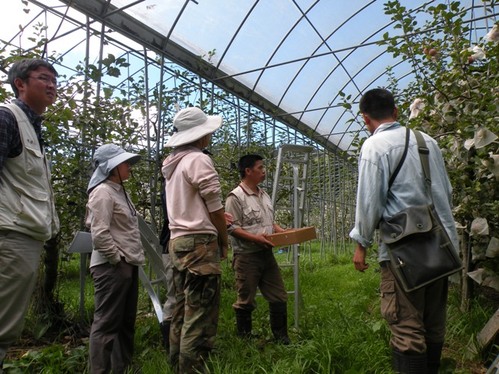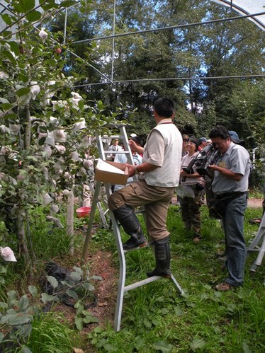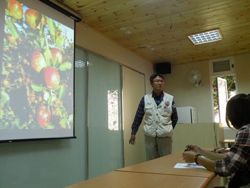 091016一早晴空萬里,臺大山地農場各組同仁齊聚教育展示中心,聆聽解說員袁蜀龍的採果簡報分享後,便一起邁步前往蘋果園,實際操作、演練整個採果的流程。