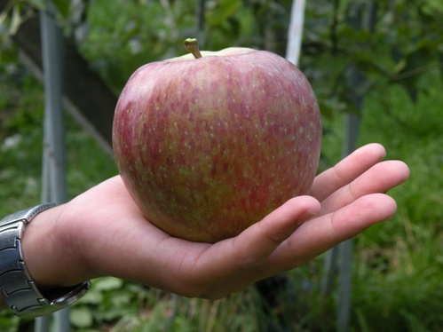 ↑然後用手握住蘋果,用大拇指壓住蒂頭,往上一扳,就可以順利採下一顆蘋果。