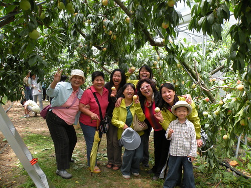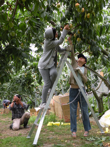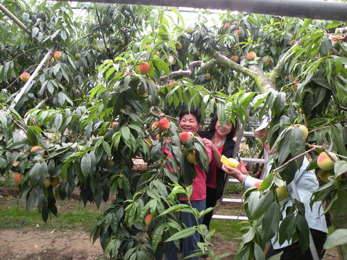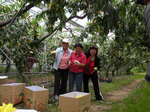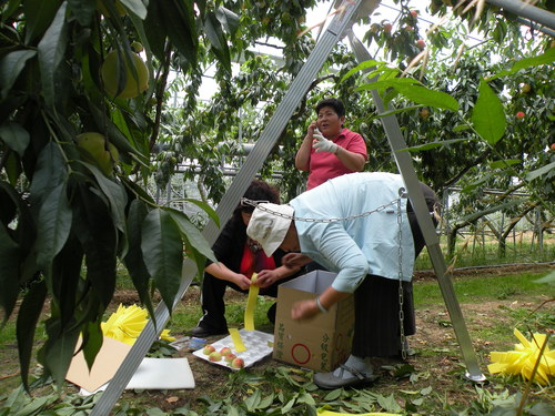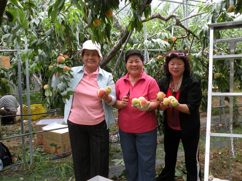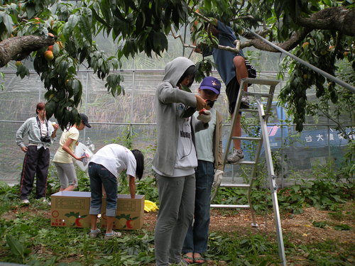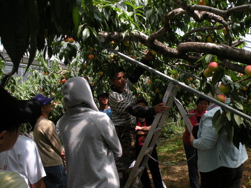 重點行程是第二天上午的水蜜桃採果,聽過水蜜桃王子及水蜜桃達人的說明及示範後,做做暖身,就要開始採果嘍!看到滿樹結實纍纍的水蜜桃樹,大家都很開心,一邊忙著採果,一邊忙著打電話給親朋好友周告自己正在採摘水蜜桃的幸福。