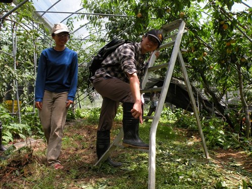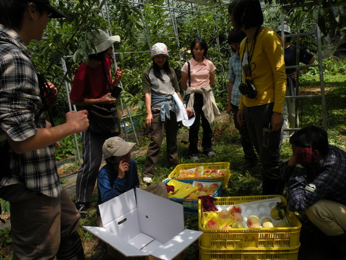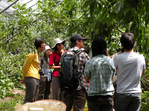 ↑桃太郎負責人祈男(左)為解說員們說明採果流程。