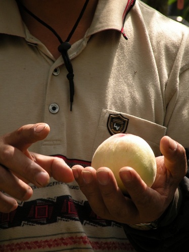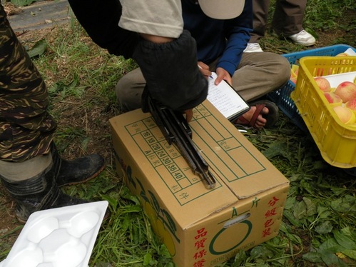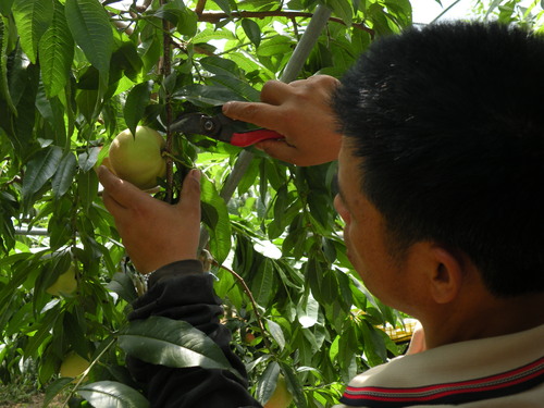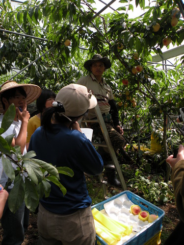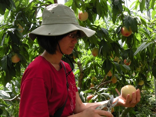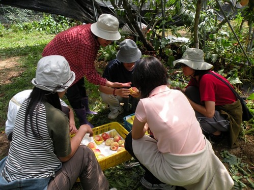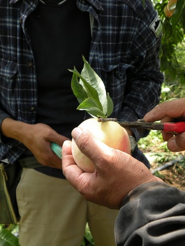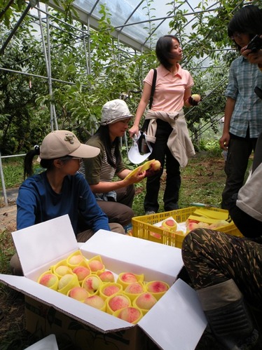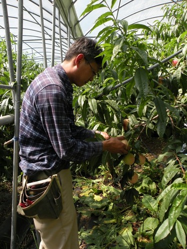 那麼,一開始就讓解說員與您簡單的分享屬於您的水蜜桃樹生活點滴。然後,在解說員與工作人員的指導下,拿著屬於你們的剪刀(一棵樹四把剪刀),一隻手戴著手套,把成熟的水蜜桃(果蒂周圍呈鵝白色,中津白桃屬於“白桃”,因此是不會轉紅的哦!)一顆顆採下(或直接用手往上拗折,即可採下)。要特別注意的地方是,水蜜桃是一種非常嬌嫩的水果,手得輕輕的托著,採下後,用掌心捧著,稍微把過長的果蒂修剪(果蒂儘可能留存,以避免病原菌侵入),以避免戳傷其他水蜜桃,既而“蒂頭朝下”交給在樹下的其他人,用黃色的海綿保護後才放上水果盤。