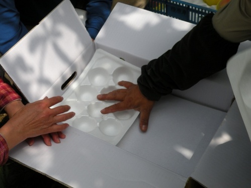 ↑準備裝箱嘍,把六粒的果盒放至底部。