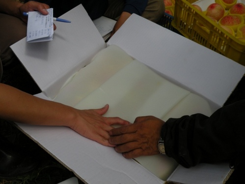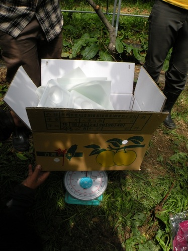 包裝時,我們有提供六粒、八粒及十粒的果盤,以及兩個可以裝四盤的紙箱(為響應環保,鼓勵水蜜桃爸爸媽媽們自行攜帶紙箱、果籃;如需送禮,梅峰農場現場亦有準備禮盒可供購買。)請將果實放在合適的果盤內,大粒的放在最下層,附上一層泡棉,再加上一層紙板,依次往上。最後一層的泡棉,需要特別往有空隙的地方填塞,然後將紙盒蓋上,用大訂書機封上後,抬上磅秤秤重。就完成了此次的採果活動嘍!
