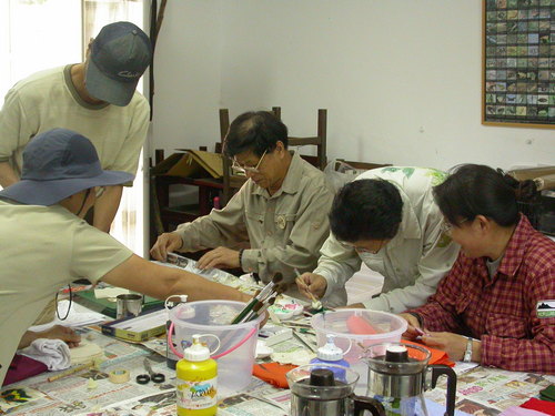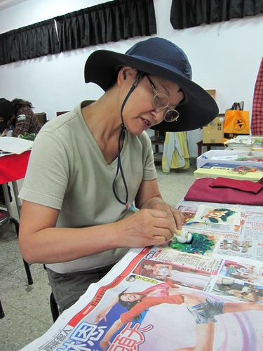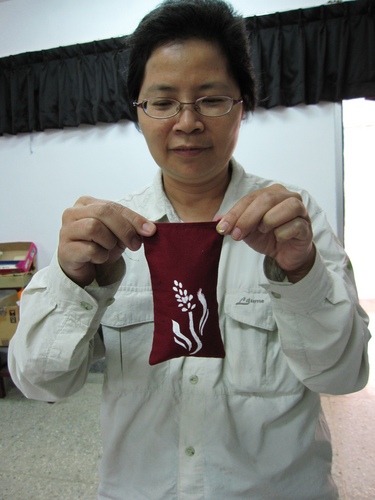 ↑專心致意的做著香包的解說志工。