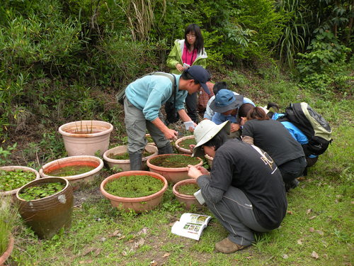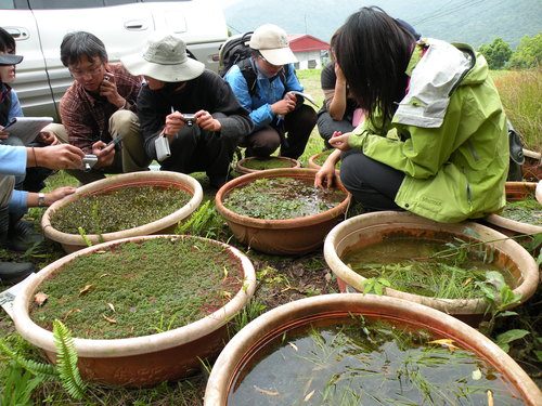 ↓正圍著春陽水生植物池,熱烈討論、學習的解說員們!
