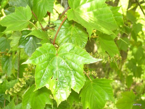 極淺五裂,脈掌狀5條,葉柄扁平有溝,暗紅色,落葉前轉鮮紅色。