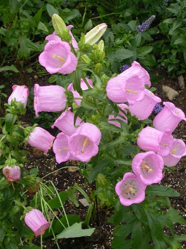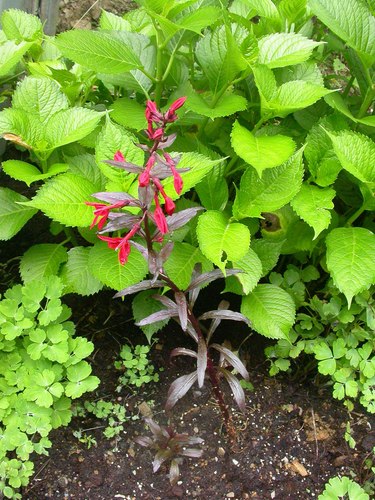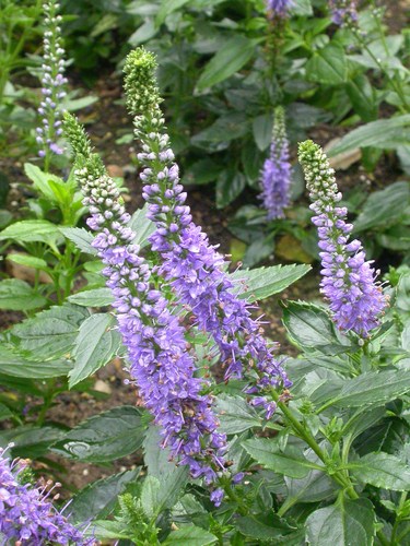 洋繡球、三色堇、狐尾武竹、黃花月見草、松紅梅、花薊、耬斗菜、萱草、山芹菜(紫)、大花山梗菜(六倍利、紅花山梗菜,花紅葉綠)、玉簪