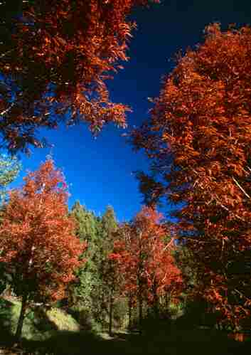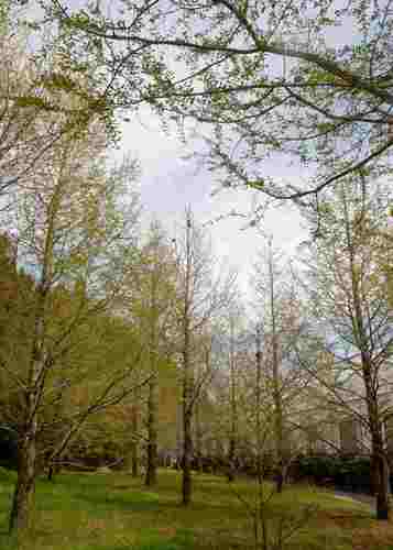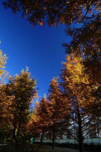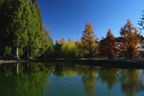 音符是從葉稍開始滲進去的!也許是晚上接近零度的氣溫加速了音符直竄而入的速度;還有白日無遮的高溫反覆烘烤著葉脈的深纹,看不出表情的綠退去了,換上一身鮮豔帶橘的黃,燃燒成片,那分駐兩旁的水杉林,高舉著劈啪作響的自己,慶祝秋日的臨來!