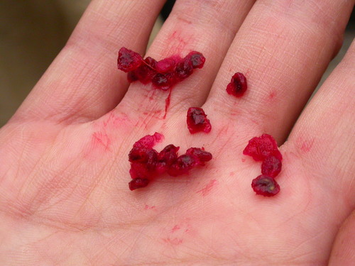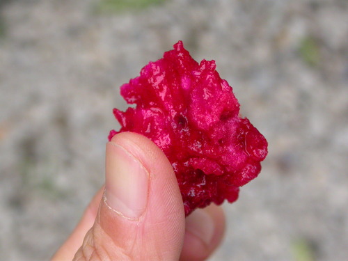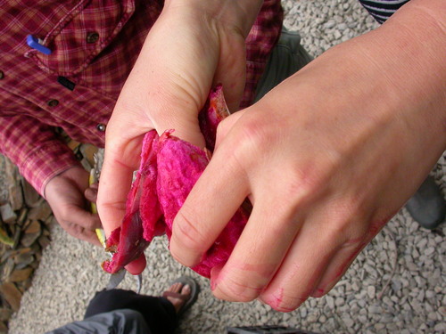 說著說著,「坐而言不如起而行」,大夥決定採一顆下來吃吃看。不過這東西外頭可都是細刺呢!吃的時候要特別小心。同事找出撈水藻用的網子,穿越密刺包圍的大綠扇仙人掌,順利的採下一顆,小心的剪除外皮上的刺,輕輕的撥開,跟火龍果蠻像的,誰叫它們都是親戚呢!嗯,吃起來的時候有一種淡淡的香味,而且很甜呢!