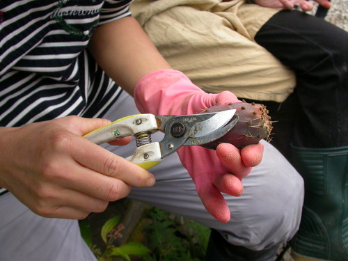 【↑“剪刀手”拿著枝剪負責把外頭的細刺剪掉。】