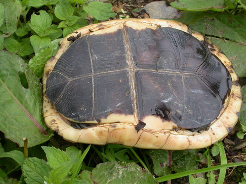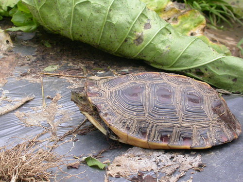 秘書趕緊打了電話,電召蜀龍帶了圖鑑直赴現場,好好比對一下牠的身世。原來是一隻食蛇龜,也叫做「閉殼龜」,牠腹面的殼是「可動式」的,可以分開上下,把蛇夾昏,不過這部份也可能是歸於「傳說」之列了。拍完照,也就讓她離開了,誰知道家裡頭是否有孩子在等她?