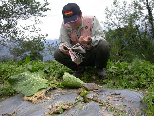 那是接近中午的時候,秘書巡視場區至菜地附近時,不經意的遇上了一隻烏龜。這可是天大的驚奇了,梅峰出現烏龜?!