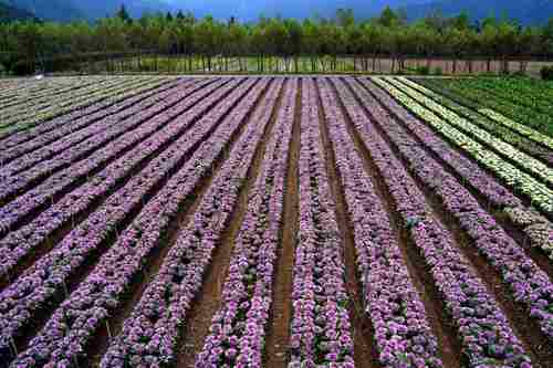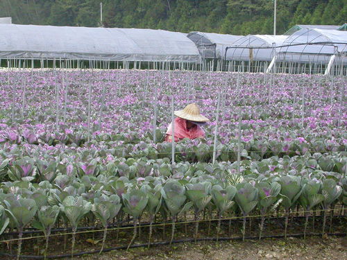 於是高麗菜在梅峰的使命,由「彩葉甘藍」接手繼續。所謂的「彩葉甘藍」又稱為「葉牡丹」,因為葉子在低溫下會漸漸轉色,到了9月下旬後,尤其是10、11月,因為品種的不同,可以變成紫紅色或黃白色等各式顏色,就像一朵牡丹花似的,只是花瓣的組成,是我們一般所稱的「葉子」,所以有個這麼美麗的名字。她和你在平地所見的「紫色高麗菜」──沙拉盤中可以添加的選擇之一,卻又是不一樣的東西哦!她的纖維較粗糙,不太適合拿來食用,主要作為插花用的花材。