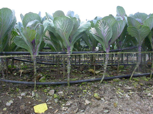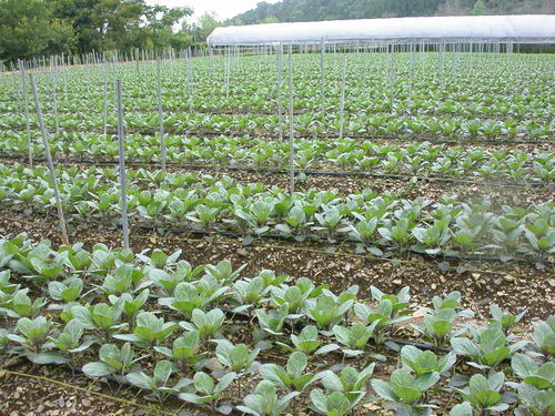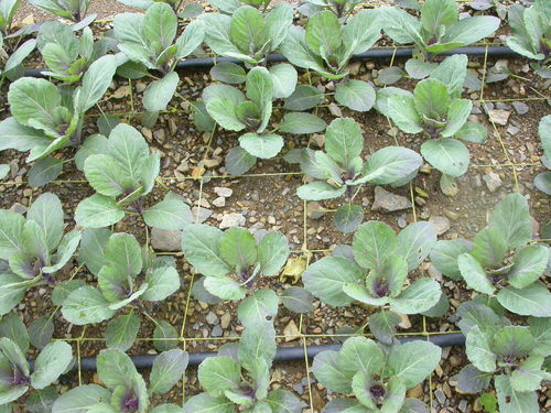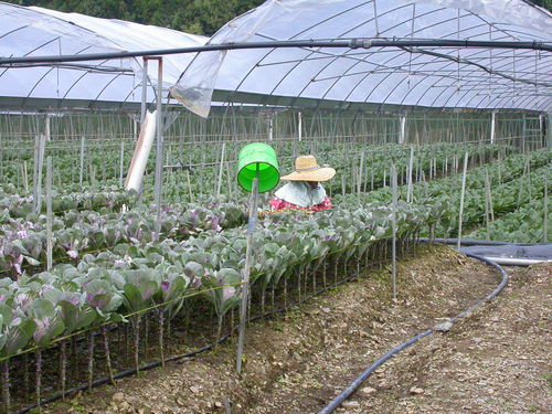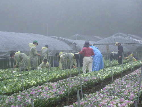花卉組的同事們,在5-7月份時就必須將她們在方形的網格裡種下,這樣的過程中,同事們並不是閒著,把花都交給大自然照顧哦!他們必須定期幫這些葉牡丹「脫衣服」,留下最上頭的葉子,讓她們可以有花球的形狀,底下的葉子則通通要剝掉,這樣才能讓葉牡丹增加通風,降低病害,減少重量,並防止倒伏!隨著時間過去,她們將慢慢的長高,網子也將慢慢拉高,保護她們不致於因為頭太重而傾倒。時近秋日,直到大概可以接近一公尺上下的挺拔,或者30-40cm也可以,只要貨少,轉色佳。也就可以採收販售到花市裡,供插花人士來選用了。