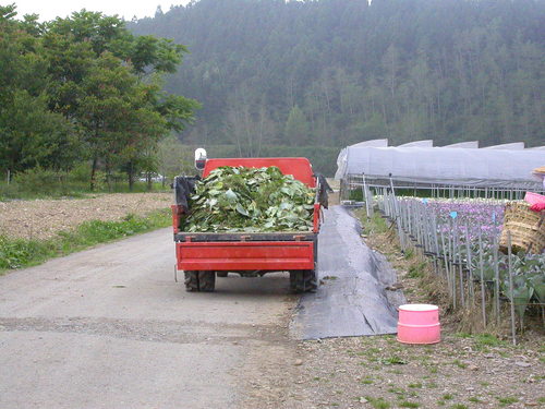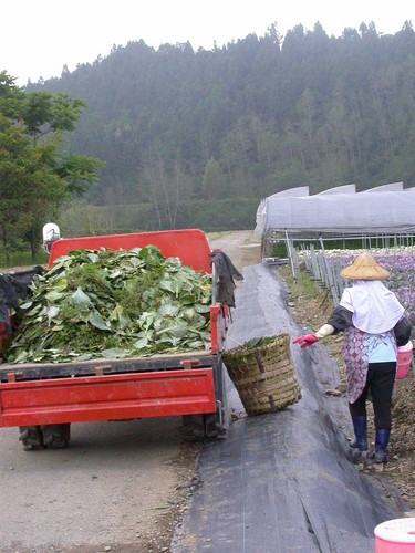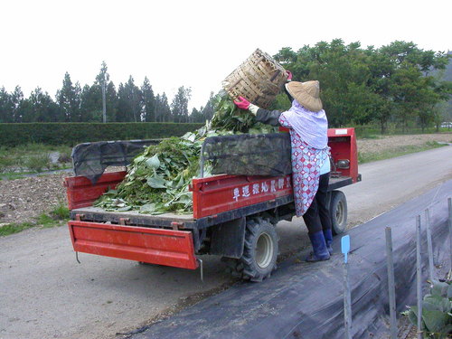 「照片為 現場工作人員 將剝除後的葉子,傾倒至鐵牛車裡」