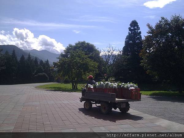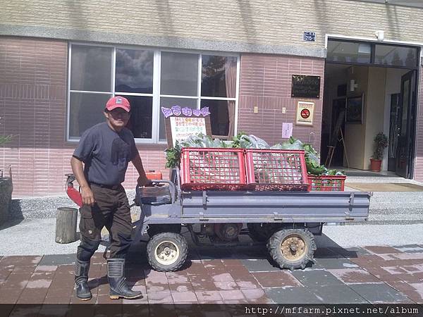 梅峰的菠菜,由菠菜館館長 彎刀大哥載運給來場的遊客們選購。