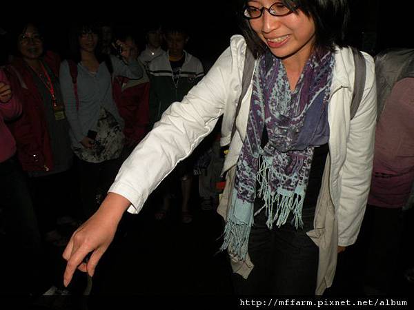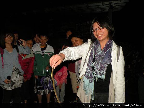 星星們都躲在雲後頭,不過雨總算是停了。就在我們走去迷宮的路上,與磐古蟾蜍打過照面後,也在水塘畔見到了莫氏樹蛙,回程路上,遇上了一隻標蛇,還有臺大園藝系系友會的年輕夥伴,毫不猶豫的一把拉起,讓大家都驚訝無比!哦!原來她大學時就讀臺大動物系,還抓過更厲害的東西呢!