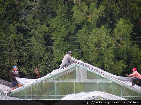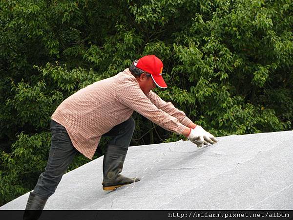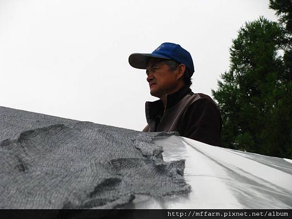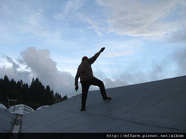 之後我們四人一起上屋頂將第一棟破損的PEP布、黑網拆下來,