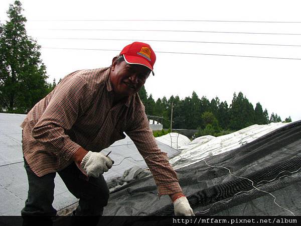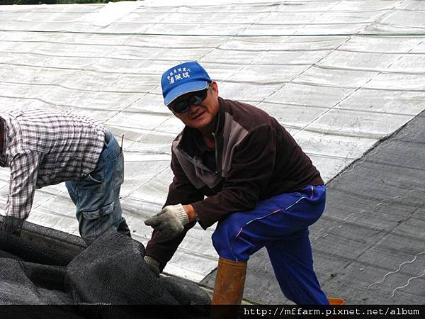 繼續將第二棟的塑膠布、黑網拆下來,並鋪上新的材料。